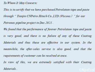 Ocean Supply And Engineering AThis is to certify that we have purchased Petrolatum tape and paste through “ Tianjin CNPetro Hitech Co.,LTD (Viscous)” for our Petronas pipeline project in Dec.2021 . We found that the performance of forever Petrolatum tape and paste is very good, and there is no failure of any of these Coating Materials and thus these are effective in our system -
